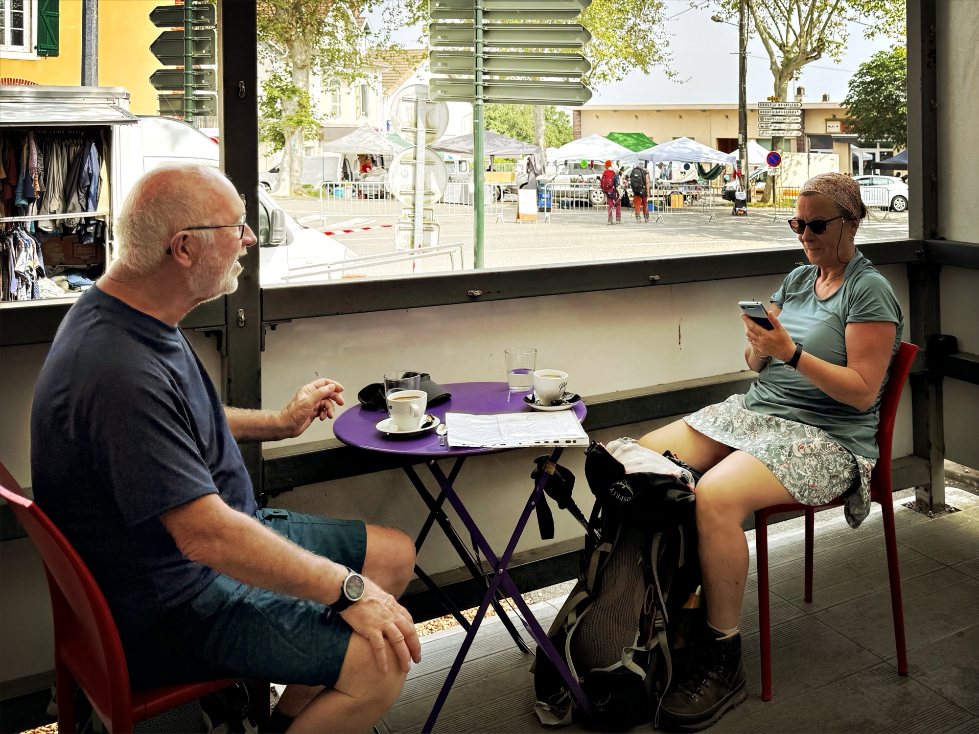 At about 9:30. Randoms, long coffee break Arthez. Broke the day into ~ 9+9 kms at about 2 1/2 hours each, this allowed a good 45 min stop here
