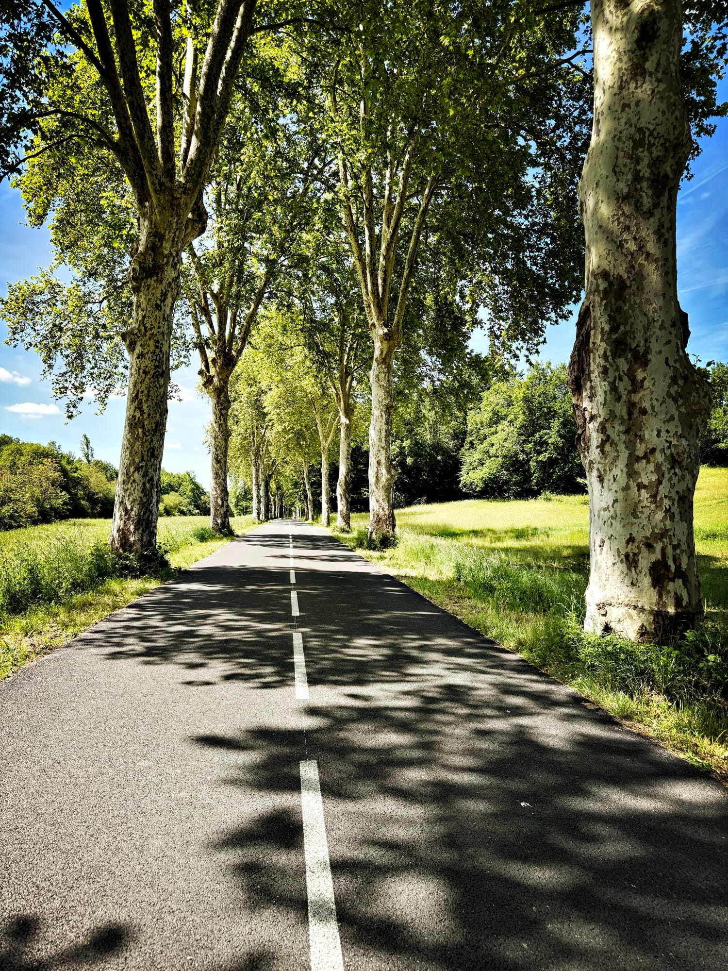 The final stretch into Moissac followed a long, tree-lined avenue. At first, it felt serene—tall trees providing shade, their branches swaying gently in the breeze. But walking along a narrow road with long stretches of hard bitumen was less than ideal. The shoulder was barely wide enough to step onto, and in many places, it dropped sharply into a drainage ditch or a shallow creek. I preferred to walk on the soft grass at the roadside, which was easier on my feet, but it wasn’t a perfect solution. Trees blocked the way at regular intervals, forcing me to step back onto the road just as cars approached. It became a constant dance—dodging trees, watching for traffic, and trying not to lose my footing.